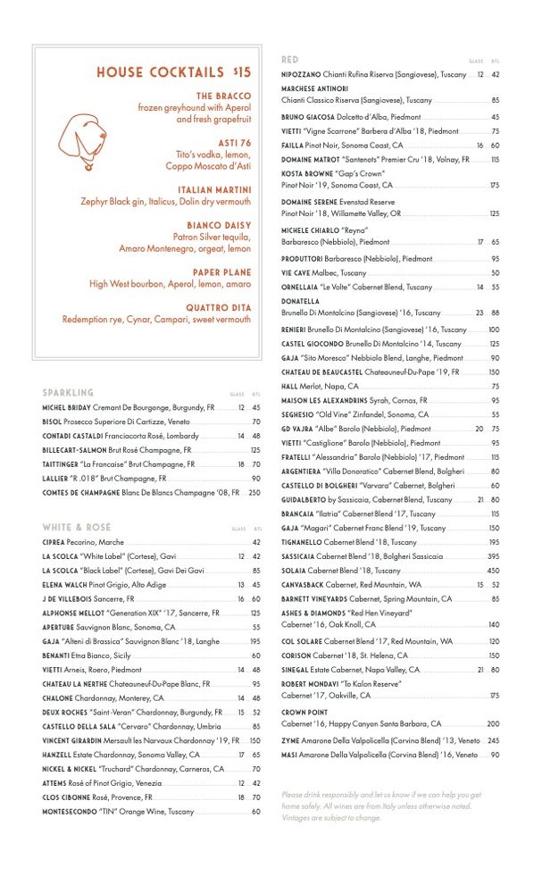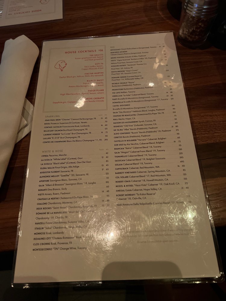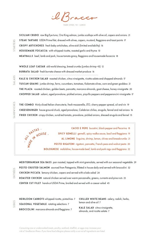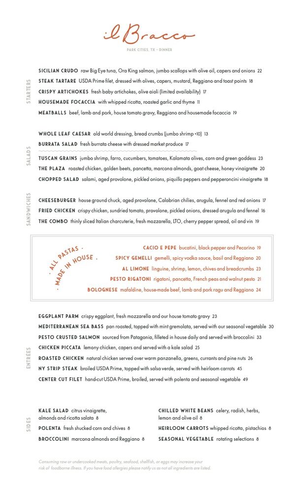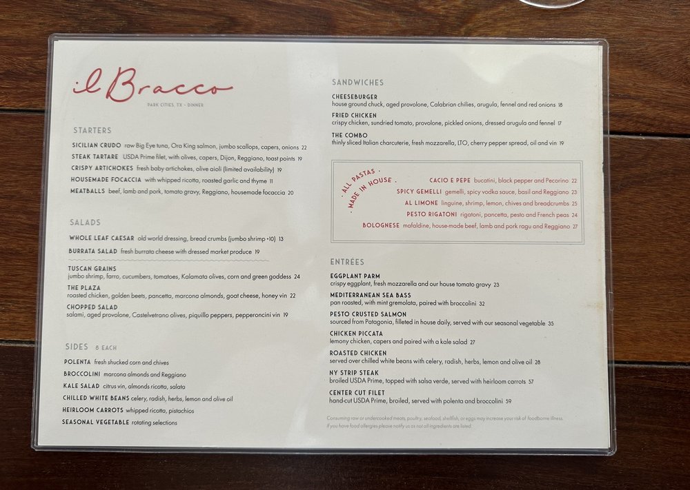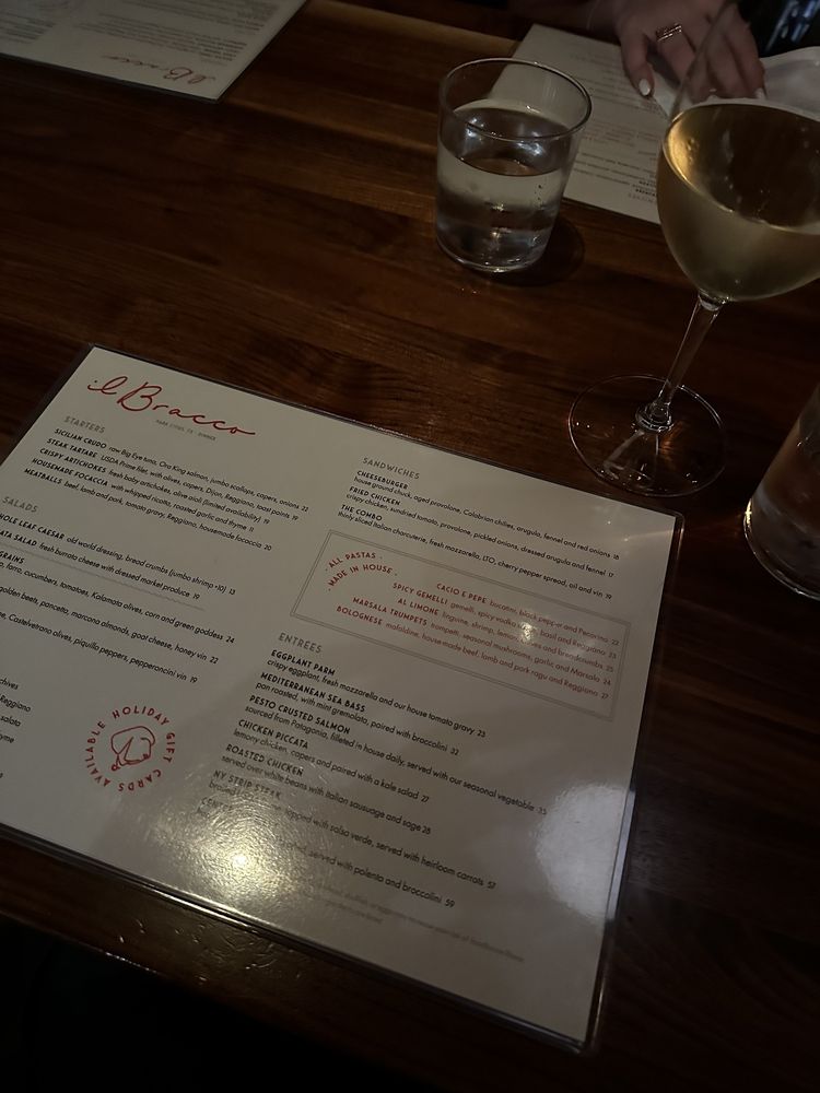 Introducing the menu at il Bracco, an upscale Italian restaurant in Dallas, Texas. Known for their hand-made pastas, il Bracco offers a diverse menu with many vegetarian and vegan options. The ambiance is posh and trendy, perfect for a romantic dinner or special occasion. Customers rave about the exceptional service and delicious dishes, like the cacio e Pepe and the sea bass with raisins. The signature ilBracco frozen drink is a must-try, along with the flavorful cocktails and extensive wine list. Parking is convenient, making it easy to enjoy a night out at this popular spot. Whether you're a fan of Italian cuisine or looking to try something new, il Bracco is a standout choice for a memorable dining experience.